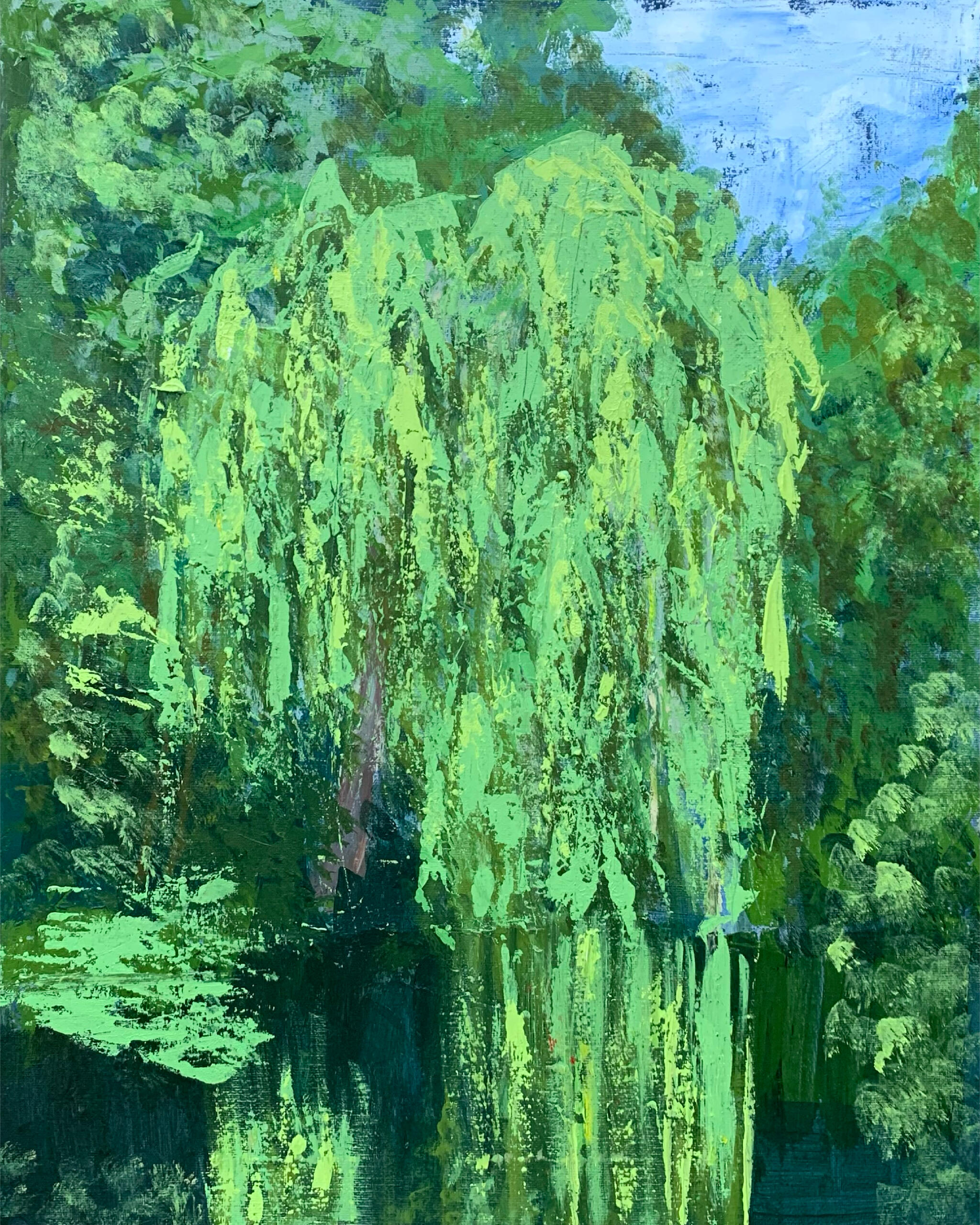 Painted as a tribute to the artist’s mother, 'The Willow Tree' captures the vitality and emotional resonance of a beloved part of nature. With loose, expressive brushwork and a vivid green palette, the piece leans into impressionism, favouring atmosphere and feeling over precision. The central figure—a willow swaying in motion—is mirrored in water below, anchoring the otherwise lush abstraction in a sense of place. Through spontaneous execution (and liberal use of a palette knife) the composition reveals careful form and quiet reverence, inviting the viewer into a space of memory and peace.