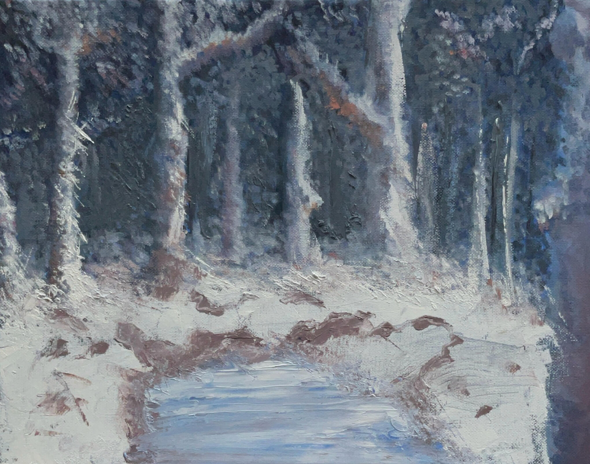 Created in the early stages of the artist’s formal training, this atmospheric winter landscape marks a pivotal moment of clarity and connection. Though composed for an academic assignment, the piece carries a charged stillness and quiet depth that emerged instinctively. Deep layering and atmosphere conjure a scene that feels less observed than remembered—half memory, half apparition. It has since served as a visual anchor in the artist’s portfolio, symbolizing a first moment of confidence, presence, and voice.